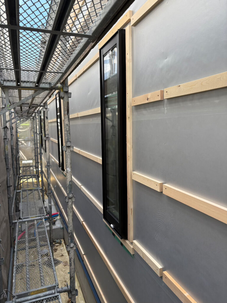 外壁材を取り付けする前に、外壁下地を施工していきます。下地材に胴縁(どうぶち)という施工をしていきます。