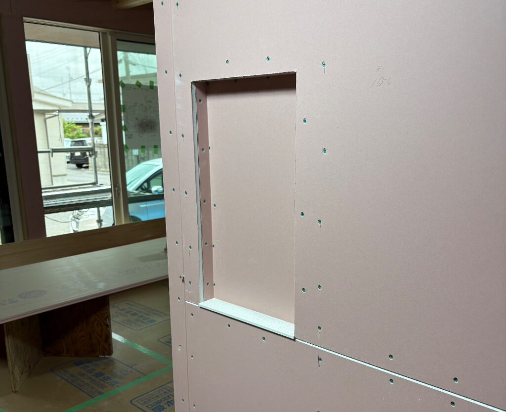 石膏ボードは現場で大工さんがサイズを測り、必要な大きさにカットしています✂️