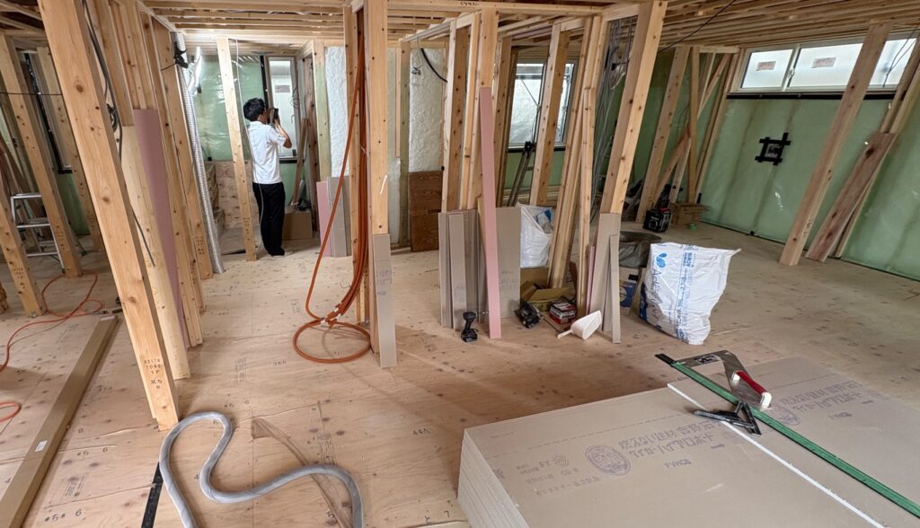 その上から石膏ボードを施工していくことで、断熱・気密・耐火の三拍子そろった壁になるんです🎵