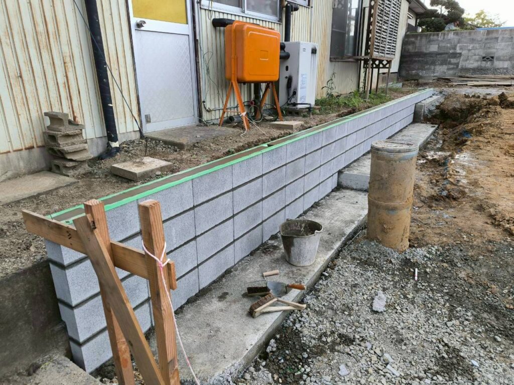 敷地境界のブロックを積んだり、土を掘削・整地したり、必要があれば擁壁(ようへき)を設置したり。