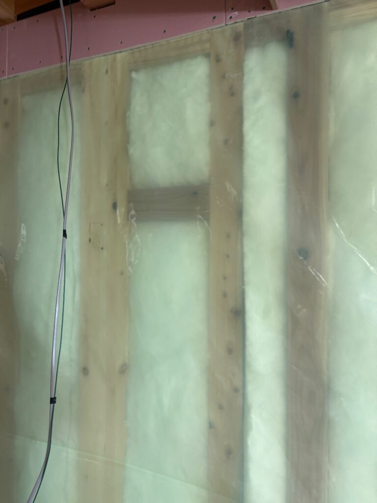アクリアウールは袋に入っていないぶん、防湿フィルムを別で丁寧に施工していきます。