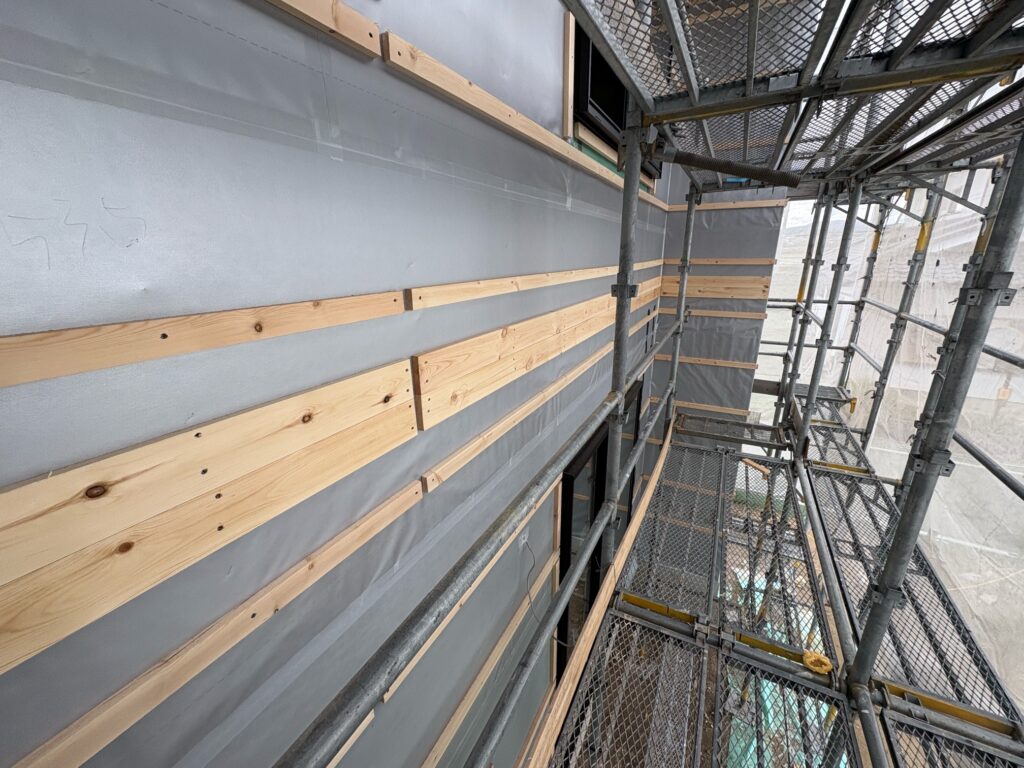 外壁の防水シートの上に、水平に胴縁が取り付けられています。