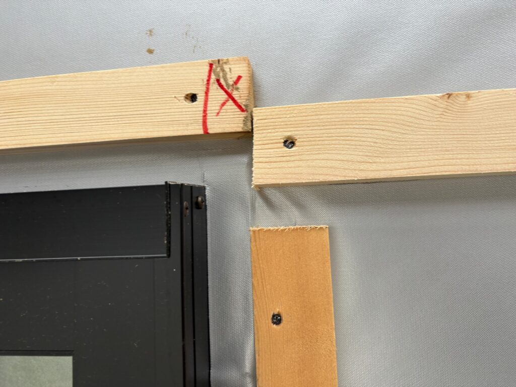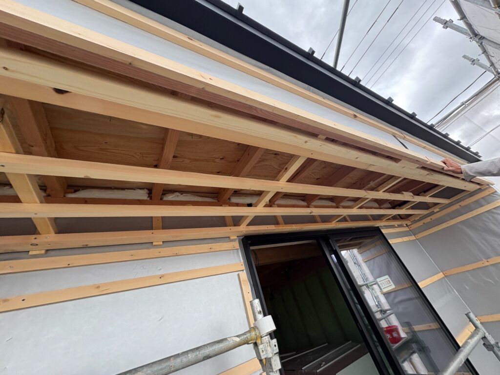 こちらは「軒天地」と呼ばれる部分で、軒天(屋根の外側にある天井)の仕上げを張るための下地を施工中です。