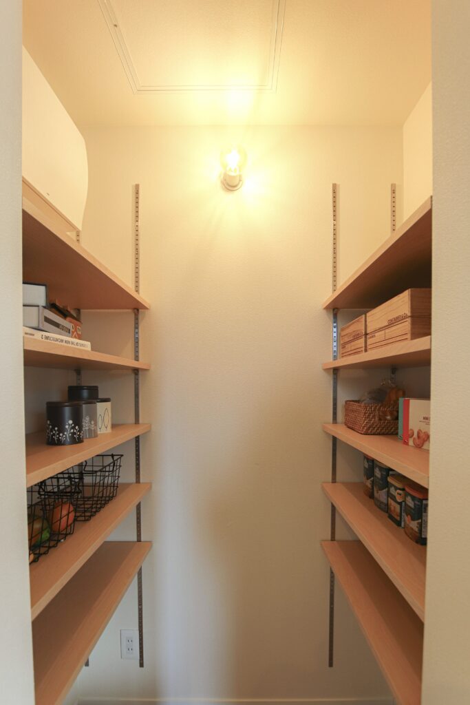 キッチン脇には1帖ほどのパントリー。缶詰などのストック類から、ホットプレートなど家電調理器具までたっぷり収納できるのでスッキリ暮らせます。