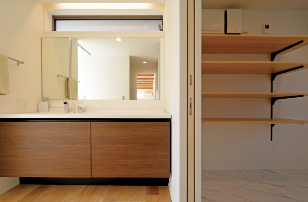 お風呂に入っていても家族が気兼ねなく洗面を使える工夫。来客時も洗濯物などの生活感を隠せるメリットが。