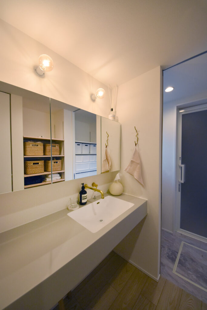 奥さまの一番のお気に入りは、こだわりの造作洗面台。一面鏡にするか、収納付きにするか迷った末に収納付きにしたことで、使いやすさとデザイン性の両立を実現。「自分のやりたいことを詰め込んだ場所なので、毎朝テンションが上がります」と笑顔で話してくださいました。