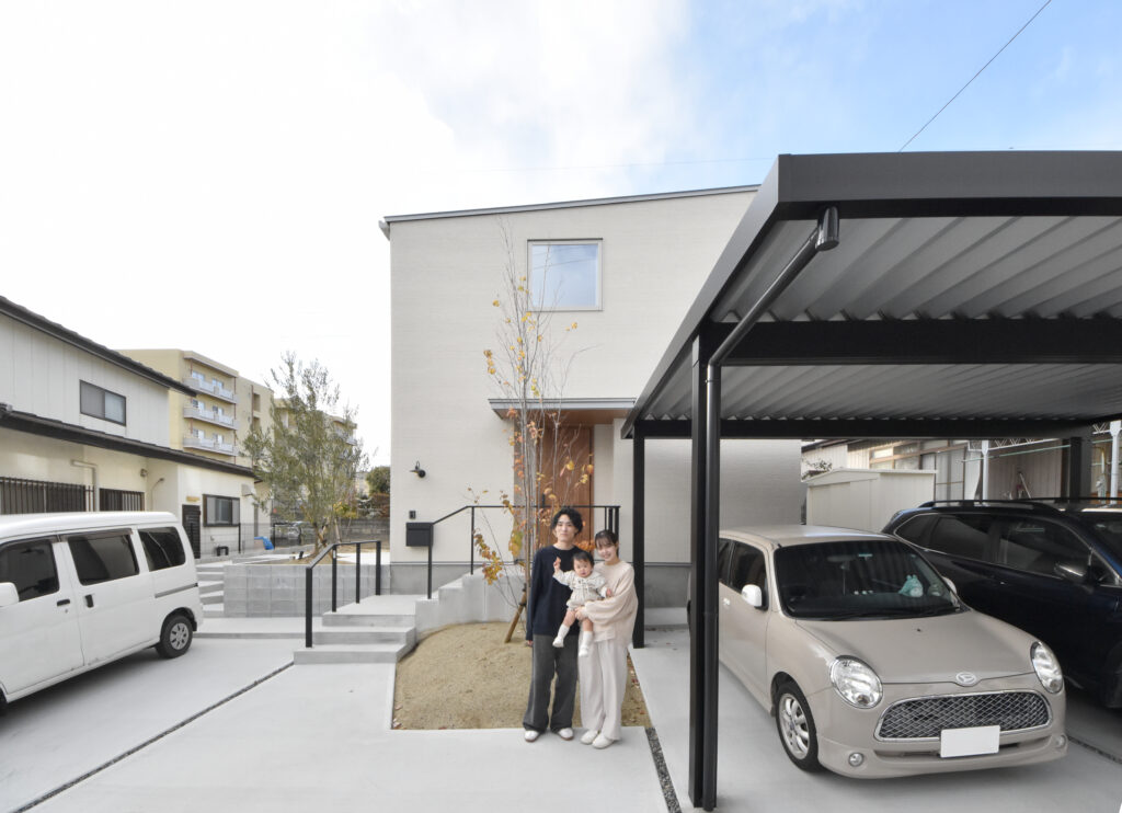 2024年に郡山市にて新築注文住宅を建築いただいたK様にインタビューさせていただきました。K様邸は無駄を削ぎ落とした美しいフォルムが印象的な外観。白を基調とした外壁に、木目のドアが温かみを添える、上質で落ち着いた住まいです。